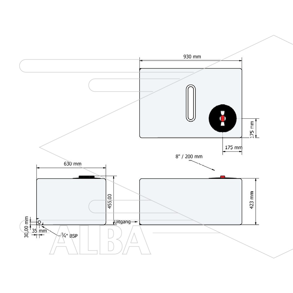 Platte watertank 210 liter met schot en een 20 cm deksel en 3/4 inch uitgang Onze 210 liter half transparante, platte watertanks zijn geschikt om drinkwater en andere vloeistoffen in op te slaan en te vervoeren. De tanks hebben een 0,75 inch messing uitgang met binnendraad. De deksel heeft een diameter van 20 cm. De tanks is voorzien van schotten tegen het klotsen.