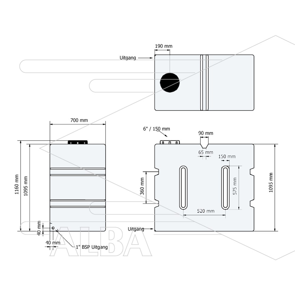 Verticale watertank van 800 liter met schot en een deksel van 15 cm en 1 inch uitgang Onze 800 liter half transparante, verticale watertanks zijn geschikt om drinkwater en andere vloeistoffen in op te slaan en te vervoeren. De tanks hebben een 1 inch messing uitgang met binnendraad. De deksel heeft een diameter van 15 cm.